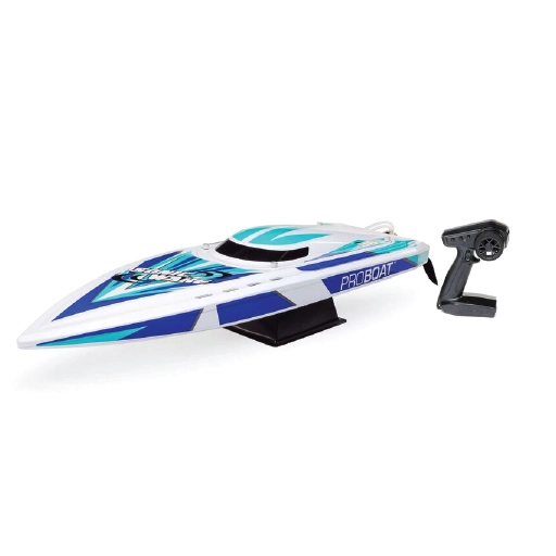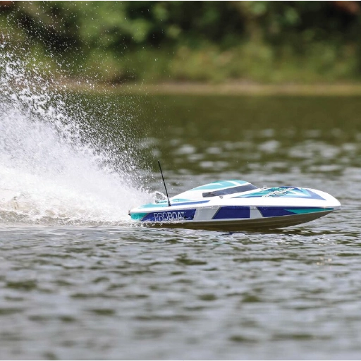 Powered by a Spektrum Firma™ 1900Kv 4-pole water-cooled brushless motor and a Spektrum 120A marine ESC, this boat can reach 50+ MPH with the recommended LiPo batteries. Adjustable trim tabs, large turn fins, and an aluminum breakaway rudder ensure smooth handling and precision turning at high speeds.