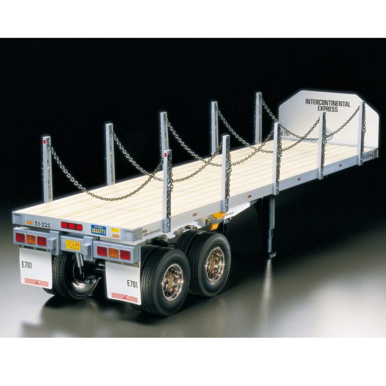 The Tamiya Flatbed Semi-Trailer is a highly realistic 1/14 scale model designed to be used with Tamiya’s 1/14 scale R/C tractor trucks. It features authentic components including an aluminum chassis/frame, a wood-floored platform, and actual chains to achieve a true-to-scale appearance.