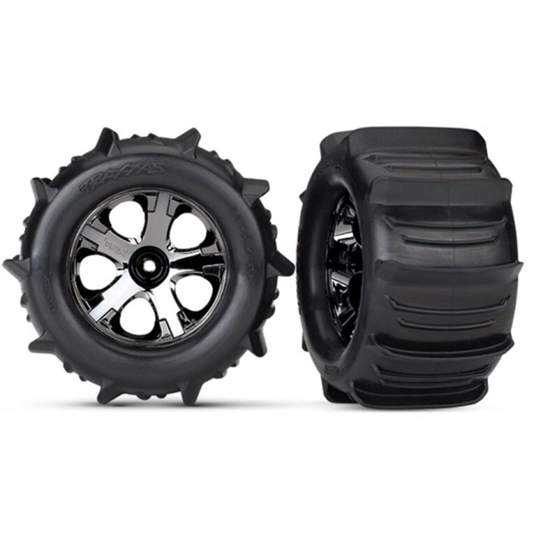 Traxxas Tires & wheels, assembled, glued (2.8″) (All-Star black chrome wheels, paddle tires, foam inserts) (nitro rear/ 4WD electric front/rear) (2) (TSM rated)